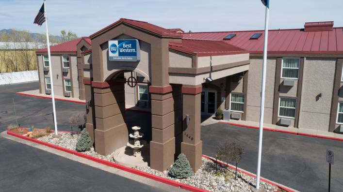 The Best Western Executive Inn & Suites is a 84-room, two-story, smoke-free hotel built in 1981. Equipped with numerous common area and guest room amenities, this upper-midscale hotel offers guests the ability to relax alongside the indoor pool and spa, stay healthy with the 24-hour fitness center, or watch cable television on premium bedding located in each guest room. A few amenities the spacious guest rooms come equipped with include a microwave, refrigerator, work desk, data ports, a lounge chair, flat-screen television with premium cable channels, and a mountain view in select rooms. Some common area amenities the hotel has to offer consist of an indoor pool and hot tub, business center, fitness center, community-wide internet, and breakfast daily.